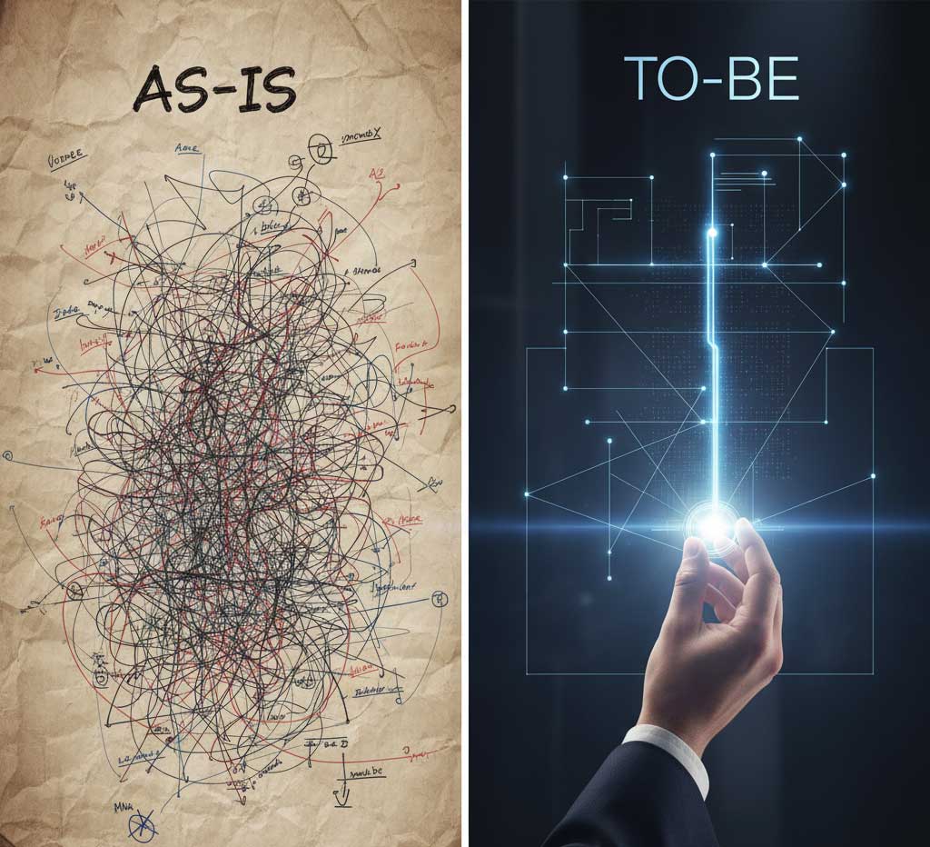 در این فاز، هدف اصلی درک فرآیندها به همان شکلی است که اکنون انجام میشوند، نه آن شکلی که تصور میکنیم. این کار با استفاده از مصاحبه با ذینفعان کلیدی، مشاهده فعالیتها و تحلیل دادههای سیستمی صورت میگیرد. خروجی این فاز، یک مدل فرآیند بصری (مثلاً در قالب BPMN) است که گلوگاهها و نقاط دردناک (Pain Points) آن مشخص شده است.